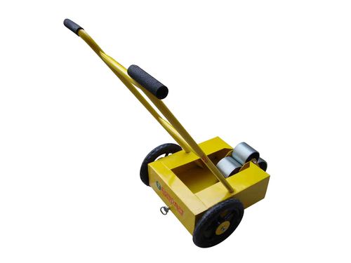 Cart for dry marking that has big twin handles, a round tank, and wheels.